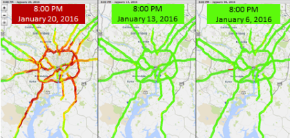 In the afternoon peak hours on Wednesday, January 20th 2016, a sudden and unexpected snow hit cold road surfaces in and around the National Capital Region. This resulted in only about an inch of accumulation, but created icy surface conditions, resulting in extremely hazardous driving conditions that lasted 17 hours before the situation returned to normal.